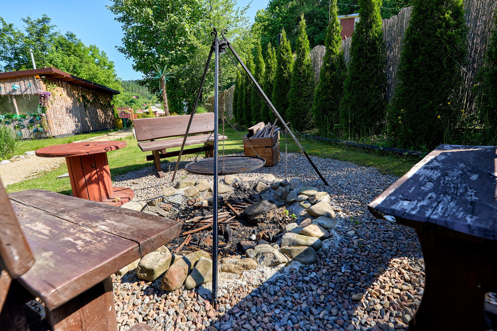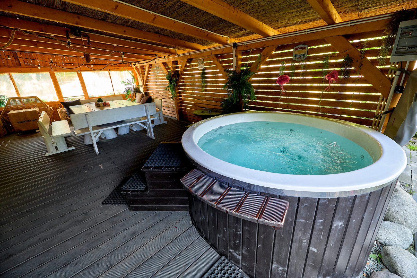 Dostępna prywatna gorąca balia w dużej altanie przy saunie, ok. 30 metrów od jurty. w cenie 150 zł za cały pobyt.