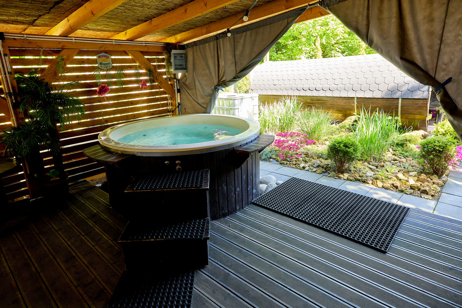 Prywatna gorąca balia znajduje się w dużej altanie oddalonej o 30 metrów od jurty. Obok jest sauna, wspólna dla gości obu jurt.