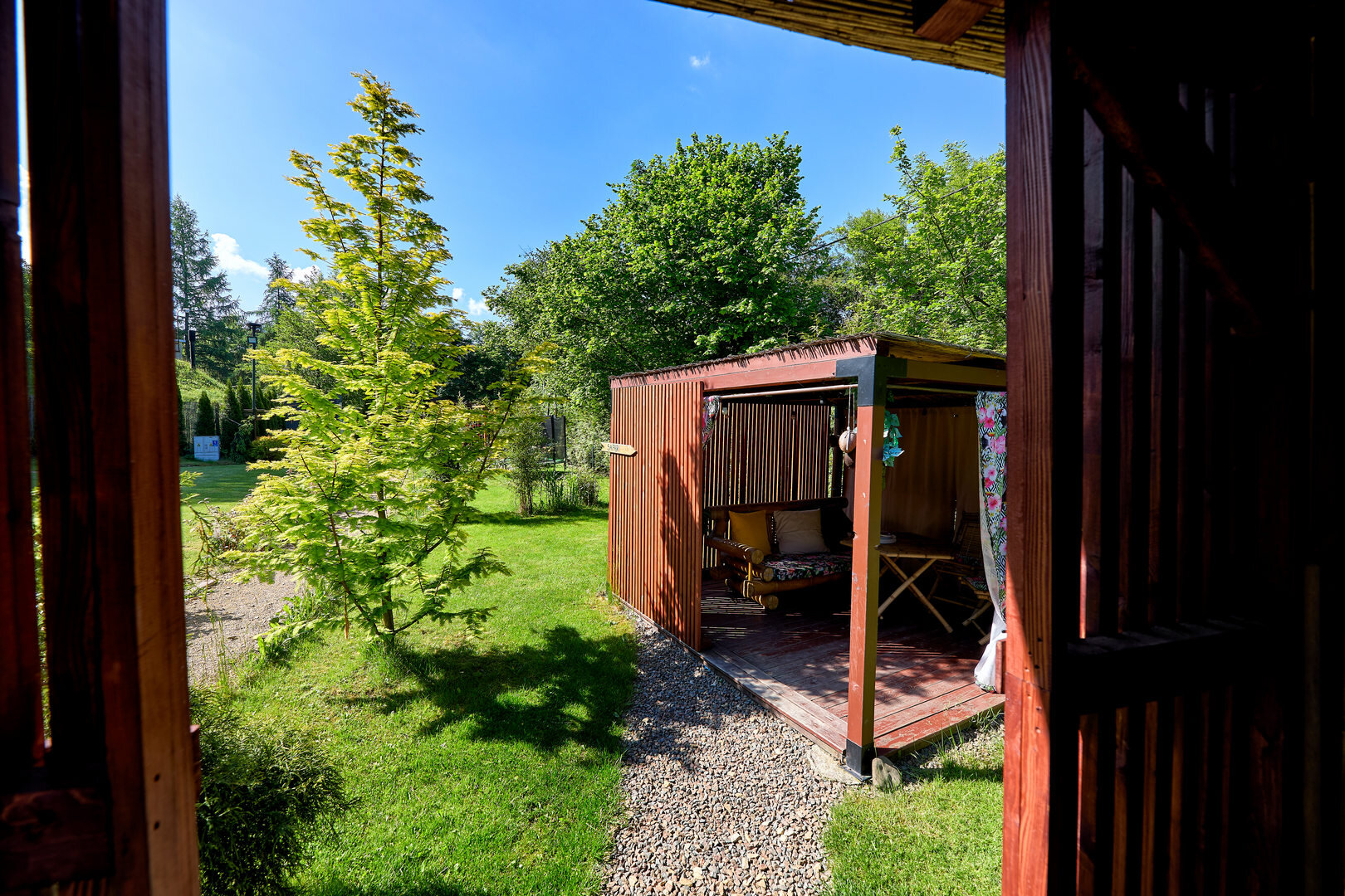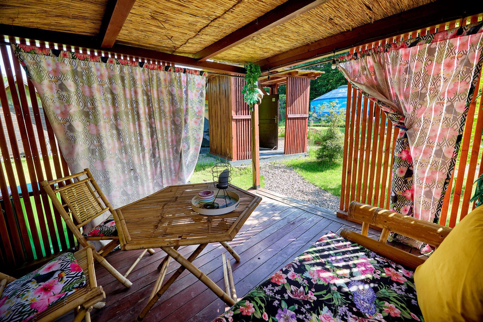 Przed jurtą znajduje się altanka z meblami wypoczynkowymi.