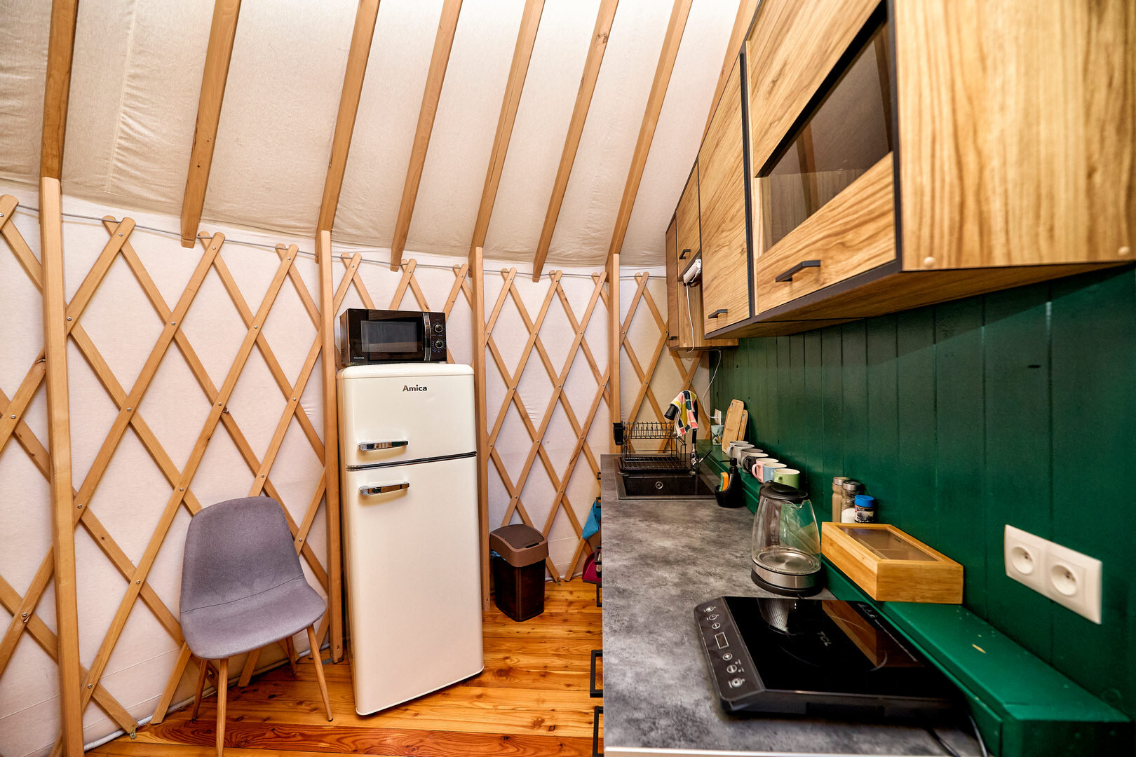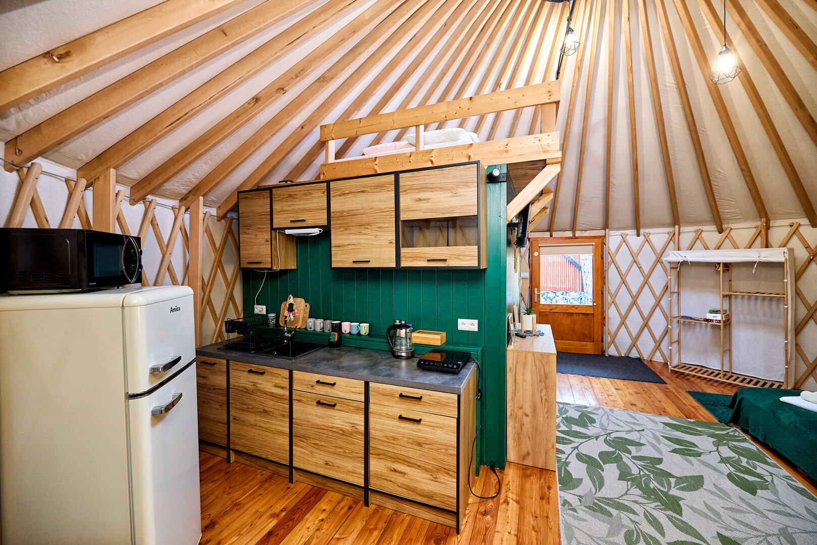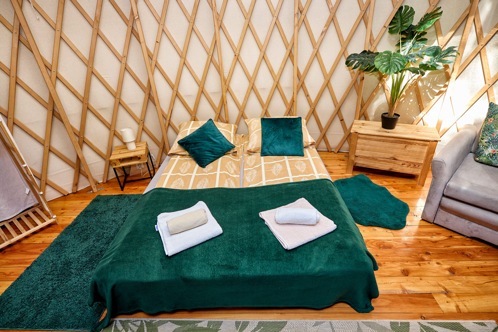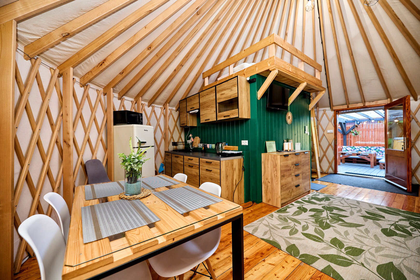 Jurta Tropiki pomieści 6 osób, posiada 2 łóżka dwuosobowe ( jedno na antresoli ) i kanapę rozkładaną również dla dwóch osób.