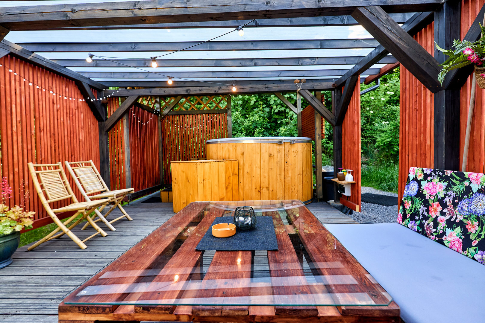 Dostępna prywatną gorącą balią w altanie przed jurtą w cenie 150 zł za cały pobyt.